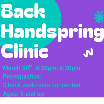 The handspring clinic is offered to those who are ready to learn the fundamentals of back handsprings or are looking to perfect their back handspring form and technique. Our coaches will provide safe but effective drills and stations that will give the participants the tool